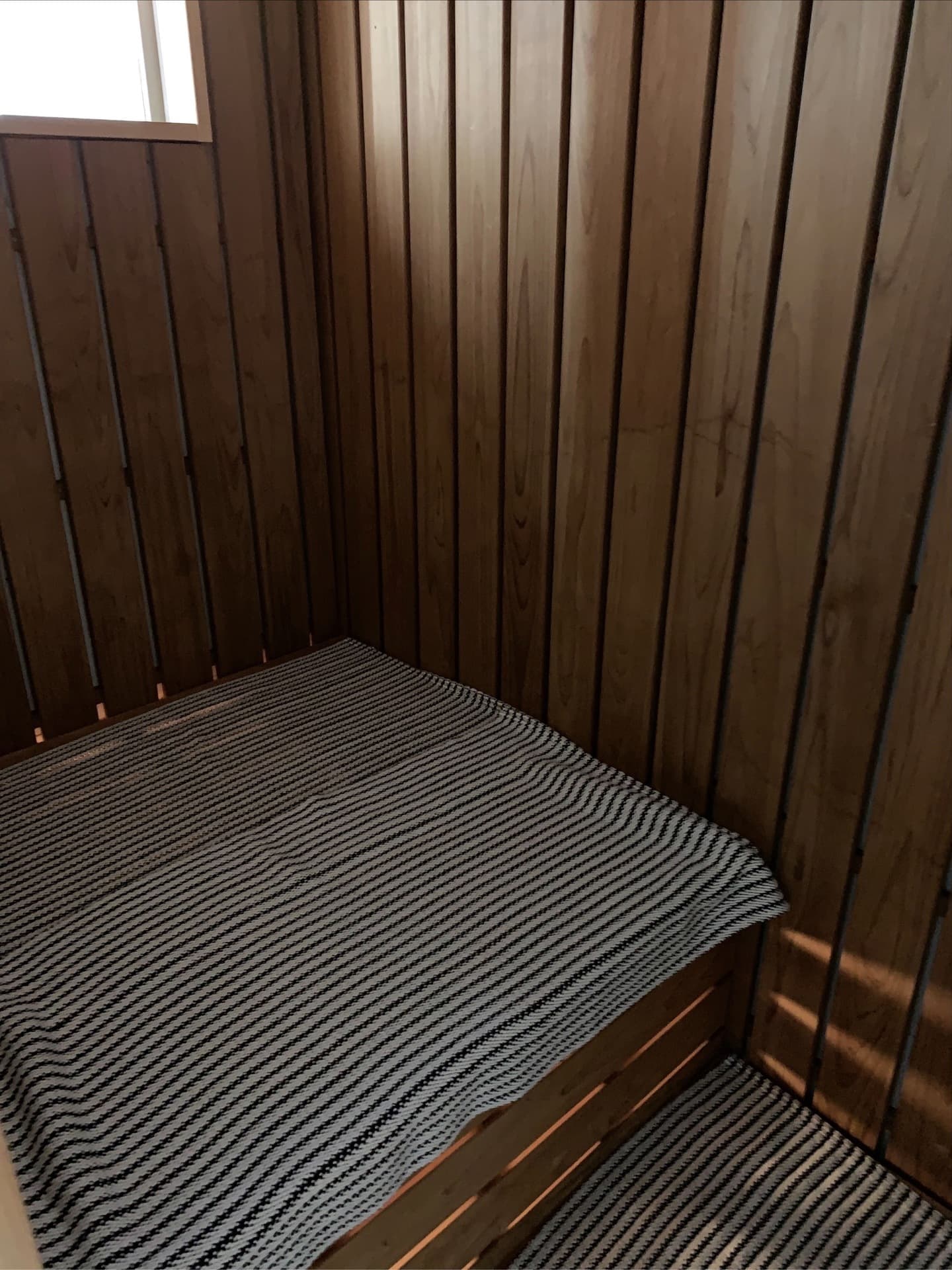 余裕を持たせた二段式ベンチは10名以上が同時にくつろげる広さ。天井高を確保した空間設計で、息苦しさを感じさせずに深いリラックスを誘います。