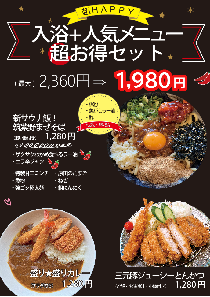 CHIKUSHITEI ランチカフェ 筑紫亭 地産食材、こだわりの食材を使用し、当店ならではの味にたどり着きました。ヘルシーあり、ガッツリありの食堂です。お風呂あがりのソフトクリームは大人にもお子様にも大人気!お得な「ご入浴とお食事のセット」もございます。