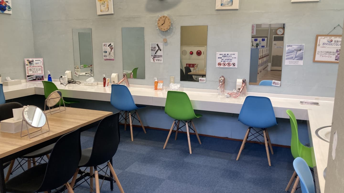 温泉やサウナ上がりのリラックス後も、最高の自分に整えられる、ゆとりあるパウダールーム。筑紫の湯の女性用パウダールームは、広々とした空間にこだわり、ゆったりとお化粧直しやヘアセットを楽しんでいただける設計です。大型一面鏡×美容ライト明るさ・色味を調整できるLEDライト付きの大型鏡で、自然光に近いコンディションでメイクが可能。荷物を置くスペースも充分です。